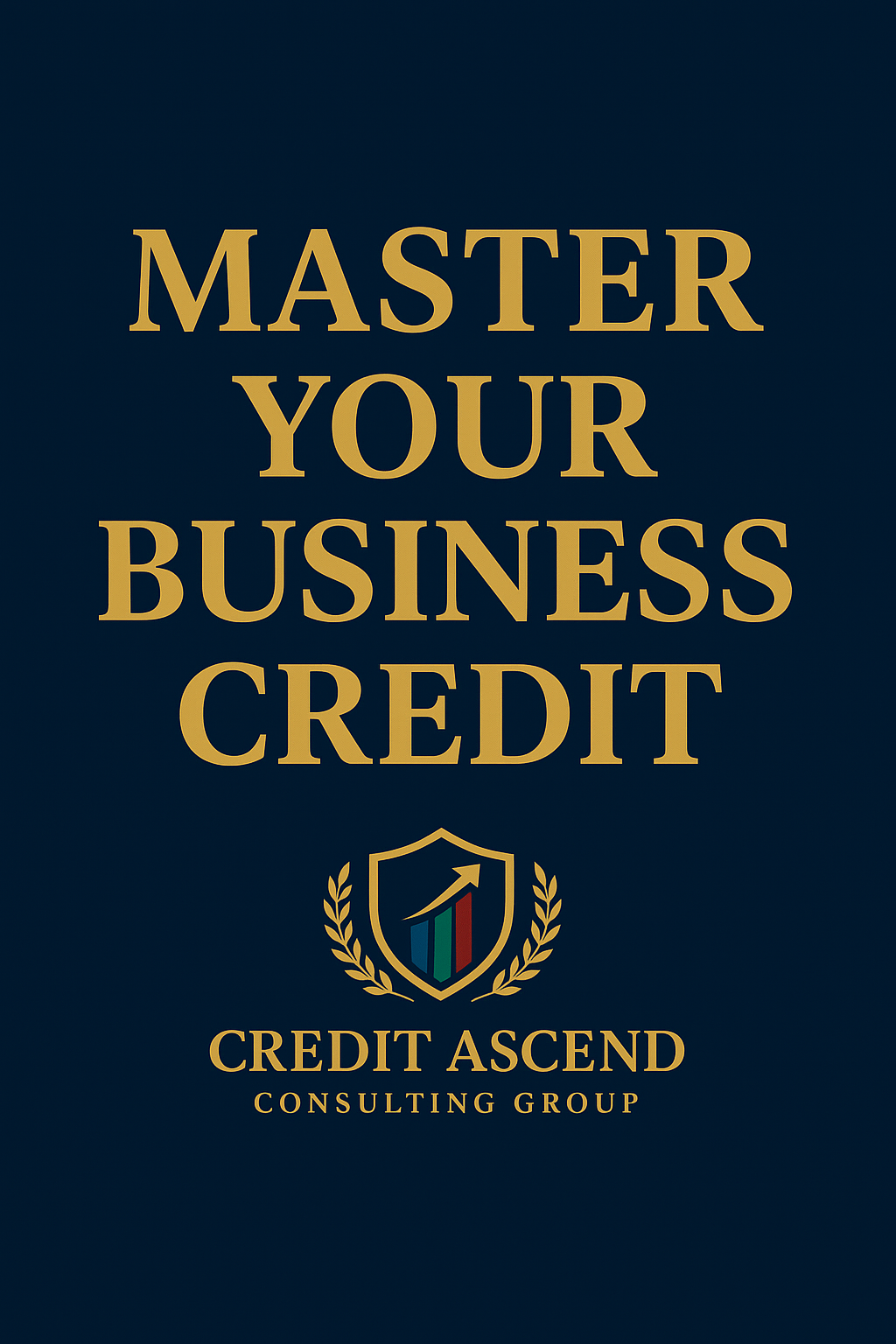 A dark blue background with gold text that reads "Master Your Business Credit." There is a shield-shaped logo with an upward-trending graph and laurel leaves, along with the text "Credit Ascend Consulting Group."
